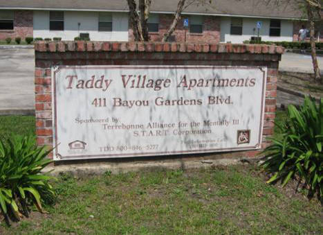 |             Taddy Village After developing this project, Start is currently acting as the managing agent. Located at 411 Bayou Gardens Blvd. in Houma, this project is a 24-unit HUD 811 complex that offers safe and affordable housing to people with mental illness who meet low-income requirements. All apartments at Taddy Village are one-bedroom units. Rents are sliding-scale and dependent on the participant's income level. Taddy Village offers a community feeling of support and acceptance in a safe and secure environment. (Capacity: Program can house 24 individuals)     Meeting room Laundry room One of the residen'ts living rooms A well organized kitchen             A lovely bedroom Bathroom shower and sink   |